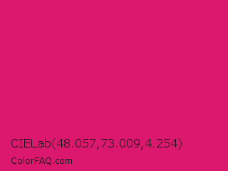 CIELab 48.057,73.009,4.254 Color is a normal rose color and the nearest color is Dogwood Rose #d71868. Hex code #db186e and RGB value is rgb(219,24,110). In RGB color space, this color is composed of 86% red, 9% green, 43% blue, In CMYK color space, this color is composed of 0% cyan, 89% magenta, 50% yellow , 14% black , In HSL color space, this color has a hue angle of 334° , 80% saturation and 48% lightness.