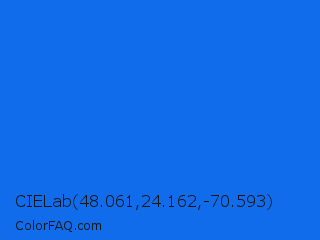 CIELab 48.061,24.162,-70.593 Color is a normal blue color and the nearest color is Blue Crayola #1f75fe. Hex code #116ceb and RGB value is rgb(17,108,235). In RGB color space, this color is composed of 7% red, 42% green, 92% blue, In CMYK color space, this color is composed of 93% cyan, 54% magenta, 0% yellow , 8% black , In HSL color space, this color has a hue angle of 215° , 87% saturation and 49% lightness.