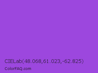 CIELab 48.068,61.023,-62.825 Color is a normal purple color and the nearest color is Navy Purple #9457eb. Hex code #9c47de and RGB value is rgb(156,71,222). In RGB color space, this color is composed of 61% red, 28% green, 87% blue, In CMYK color space, this color is composed of 30% cyan, 68% magenta, 0% yellow , 13% black , In HSL color space, this color has a hue angle of 274° , 70% saturation and 57% lightness.