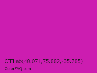 CIELab 48.071,75.882,-35.785 Color is a normal magenta color and the nearest color is Byzantine #bd33a4. Hex code #cc1db0 and RGB value is rgb(204,29,176). In RGB color space, this color is composed of 80% red, 11% green, 69% blue, In CMYK color space, this color is composed of 0% cyan, 86% magenta, 14% yellow , 20% black , In HSL color space, this color has a hue angle of 310° , 75% saturation and 46% lightness.