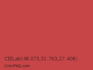 CIELab 48.075,51.763,27.408 Color is a normal red color and the nearest color is English Vermillion #cc474b. Hex code #c74547 and RGB value is rgb(199,69,71). In RGB color space, this color is composed of 78% red, 27% green, 28% blue, In CMYK color space, this color is composed of 0% cyan, 65% magenta, 64% yellow , 22% black , In HSL color space, this color has a hue angle of 359° , 54% saturation and 53% lightness.
