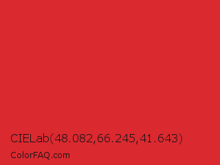 CIELab 48.082,66.245,41.643 Color is a normal red color and the nearest color is Permanent Geranium Lake #e12c2c. Hex code #db2930 and RGB value is rgb(219,41,48). In RGB color space, this color is composed of 86% red, 16% green, 19% blue, In CMYK color space, this color is composed of 0% cyan, 81% magenta, 78% yellow , 14% black , In HSL color space, this color has a hue angle of 358° , 71% saturation and 51% lightness.