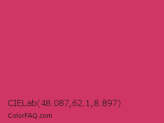 CIELab 48.087,62.1,8.897 Color is a normal rose color and the nearest color is Cerise Red #de3163. Hex code #cf3666 and RGB value is rgb(207,54,102). In RGB color space, this color is composed of 81% red, 21% green, 40% blue, In CMYK color space, this color is composed of 0% cyan, 74% magenta, 51% yellow , 19% black , In HSL color space, this color has a hue angle of 341° , 61% saturation and 51% lightness.