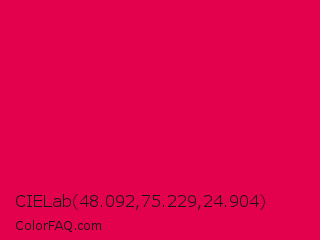 CIELab 48.092,75.229,24.904 Color is a normal rose color and the nearest color is UA Red #d9004c. Hex code #e3004d and RGB value is rgb(227,0,77). In RGB color space, this color is composed of 89% red, 0% green, 30% blue, In CMYK color space, this color is composed of 0% cyan, 100% magenta, 66% yellow , 11% black , In HSL color space, this color has a hue angle of 340° , 100% saturation and 45% lightness.