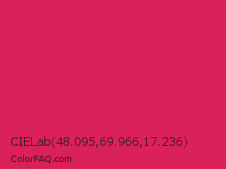 CIELab 48.095,69.966,17.236 Color is a normal rose color and the nearest color is Amaranth #e52b50. Hex code #db2159 and RGB value is rgb(219,33,89). In RGB color space, this color is composed of 86% red, 13% green, 35% blue, In CMYK color space, this color is composed of 0% cyan, 85% magenta, 59% yellow , 14% black , In HSL color space, this color has a hue angle of 342° , 74% saturation and 49% lightness.