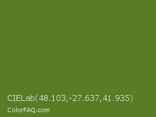 CIELab 48.103,-27.637,41.935 Color is a normal green color and the nearest color is Sap Green #507d2a. Hex code #587d25 and RGB value is rgb(88,125,37). In RGB color space, this color is composed of 35% red, 49% green, 15% blue, In CMYK color space, this color is composed of 30% cyan, 0% magenta, 70% yellow , 51% black , In HSL color space, this color has a hue angle of 85° , 54% saturation and 32% lightness.