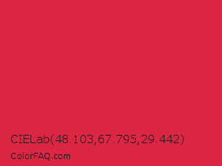 CIELab 48.103,67.795,29.442 Color is a normal red color and the nearest color is Rusty Red #da2c43. Hex code #db2645 and RGB value is rgb(219,38,69). In RGB color space, this color is composed of 86% red, 15% green, 27% blue, In CMYK color space, this color is composed of 0% cyan, 83% magenta, 68% yellow , 14% black , In HSL color space, this color has a hue angle of 350° , 72% saturation and 50% lightness.