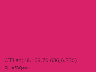 CIELab 48.109,70.636,6.736 Color is a normal rose color and the nearest color is Dogwood Rose #d71868. Hex code #d9216a and RGB value is rgb(217,33,106). In RGB color space, this color is composed of 85% red, 13% green, 42% blue, In CMYK color space, this color is composed of 0% cyan, 85% magenta, 51% yellow , 15% black , In HSL color space, this color has a hue angle of 336° , 74% saturation and 49% lightness.