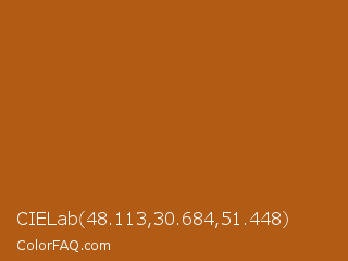 CIELab 48.113,30.684,51.448 Color is a normal orange color and the nearest color is Fiery Orange #b35213. Hex code #b15b15 and RGB value is rgb(177,91,21). In RGB color space, this color is composed of 69% red, 36% green, 8% blue, In CMYK color space, this color is composed of 0% cyan, 49% magenta, 88% yellow , 31% black , In HSL color space, this color has a hue angle of 27° , 79% saturation and 39% lightness.
