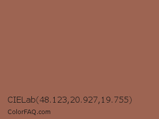 CIELab 48.123,20.927,19.755 Color is a normal red color and the nearest color is Redwood #a45a52. Hex code #9d6452 and RGB value is rgb(157,100,82). In RGB color space, this color is composed of 62% red, 39% green, 32% blue, In CMYK color space, this color is composed of 0% cyan, 36% magenta, 48% yellow , 38% black , In HSL color space, this color has a hue angle of 14° , 31% saturation and 47% lightness.