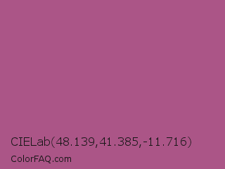 CIELab 48.139,41.385,-11.716 Color is a normal magenta color and the nearest color is Tapestry #b05e81. Hex code #ab5587 and RGB value is rgb(171,85,135). In RGB color space, this color is composed of 67% red, 33% green, 53% blue, In CMYK color space, this color is composed of 0% cyan, 50% magenta, 21% yellow , 33% black , In HSL color space, this color has a hue angle of 325° , 34% saturation and 50% lightness.