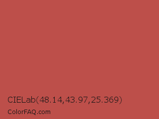 CIELab 48.14,43.97,25.369 Color is a normal red color and the nearest color is Deep Chestnut #b94e48. Hex code #bd4f4a and RGB value is rgb(189,79,74). In RGB color space, this color is composed of 74% red, 31% green, 29% blue, In CMYK color space, this color is composed of 0% cyan, 58% magenta, 61% yellow , 26% black , In HSL color space, this color has a hue angle of 3° , 47% saturation and 52% lightness.