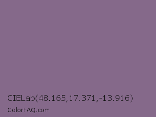 CIELab 48.165,17.371,-13.916 Color is a normal purple color and the nearest color is Chinese Violet #856088. Hex code #85698a and RGB value is rgb(133,105,138). In RGB color space, this color is composed of 52% red, 41% green, 54% blue, In CMYK color space, this color is composed of 4% cyan, 24% magenta, 0% yellow , 46% black , In HSL color space, this color has a hue angle of 291° , 14% saturation and 48% lightness.