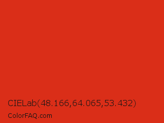 CIELab 48.166,64.065,53.432 Color is a normal red color and the nearest color is Vermilion #d9381e. Hex code #da2e18 and RGB value is rgb(218,46,24). In RGB color space, this color is composed of 85% red, 18% green, 9% blue, In CMYK color space, this color is composed of 0% cyan, 79% magenta, 89% yellow , 15% black , In HSL color space, this color has a hue angle of 7° , 80% saturation and 47% lightness.