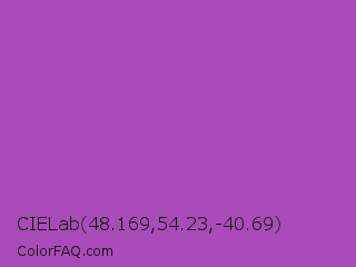 CIELab 48.169,54.23,-40.69 Color is a normal magenta color and the nearest color is Purple Plum #9c51b6. Hex code #a94bb8 and RGB value is rgb(169,75,184). In RGB color space, this color is composed of 66% red, 29% green, 72% blue, In CMYK color space, this color is composed of 8% cyan, 59% magenta, 0% yellow , 28% black , In HSL color space, this color has a hue angle of 292° , 43% saturation and 51% lightness.