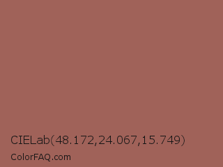 CIELab 48.172,24.067,15.749 Color is a normal red color and the nearest color is Au Chico #97605d. Hex code #a06259 and RGB value is rgb(160,98,89). In RGB color space, this color is composed of 63% red, 38% green, 35% blue, In CMYK color space, this color is composed of 0% cyan, 39% magenta, 44% yellow , 37% black , In HSL color space, this color has a hue angle of 8° , 29% saturation and 49% lightness.