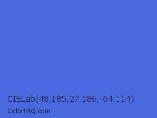 CIELab 48.185,27.186,-64.114 Color is a normal blue color and the nearest color is Royal Blue #4169e1. Hex code #4a69e0 and RGB value is rgb(74,105,224). In RGB color space, this color is composed of 29% red, 41% green, 88% blue, In CMYK color space, this color is composed of 67% cyan, 53% magenta, 0% yellow , 12% black , In HSL color space, this color has a hue angle of 228° , 71% saturation and 58% lightness.