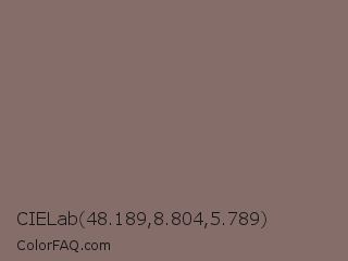 CIELab 48.189,8.804,5.789 Color is a normal red color and the nearest color is Sand Dune #826f65. Hex code #856d69 and RGB value is rgb(133,109,105). In RGB color space, this color is composed of 52% red, 43% green, 41% blue, In CMYK color space, this color is composed of 0% cyan, 18% magenta, 21% yellow , 48% black , In HSL color space, this color has a hue angle of 9° , 12% saturation and 47% lightness.