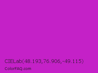 CIELab 48.193,76.906,-49.115 Color is a normal magenta color and the nearest color is Steel Pink #cc33cc. Hex code #c421c7 and RGB value is rgb(196,33,199). In RGB color space, this color is composed of 77% red, 13% green, 78% blue, In CMYK color space, this color is composed of 2% cyan, 83% magenta, 0% yellow , 22% black , In HSL color space, this color has a hue angle of 299° , 72% saturation and 45% lightness.