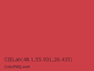 CIELab 48.1,55.931,26.435 Color is a normal red color and the nearest color is English Vermillion #cc474b. Hex code #cc3f49 and RGB value is rgb(204,63,73). In RGB color space, this color is composed of 80% red, 25% green, 29% blue, In CMYK color space, this color is composed of 0% cyan, 69% magenta, 64% yellow , 20% black , In HSL color space, this color has a hue angle of 356° , 58% saturation and 52% lightness.