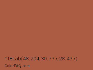 CIELab 48.204,30.735,28.435 Color is a normal red color and the nearest color is Brown Rust #af593e. Hex code #ad5c44 and RGB value is rgb(173,92,68). In RGB color space, this color is composed of 68% red, 36% green, 27% blue, In CMYK color space, this color is composed of 0% cyan, 47% magenta, 61% yellow , 32% black , In HSL color space, this color has a hue angle of 14° , 44% saturation and 47% lightness.