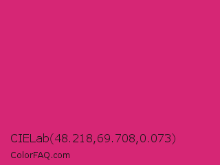 CIELab 48.218,69.708,0.073 Color is a normal rose color and the nearest color is Magenta Dye #ca1f7b. Hex code #d62675 and RGB value is rgb(214,38,117). In RGB color space, this color is composed of 84% red, 15% green, 46% blue, In CMYK color space, this color is composed of 0% cyan, 82% magenta, 45% yellow , 16% black , In HSL color space, this color has a hue angle of 333° , 70% saturation and 49% lightness.