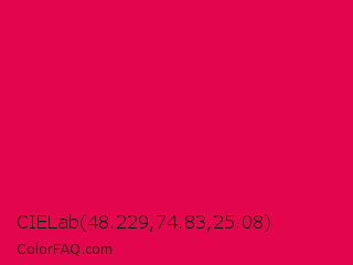 CIELab 48.229,74.83,25.08 Color is a normal rose color and the nearest color is UA Red #d9004c. Hex code #e3054d and RGB value is rgb(227,5,77). In RGB color space, this color is composed of 89% red, 2% green, 30% blue, In CMYK color space, this color is composed of 0% cyan, 98% magenta, 66% yellow , 11% black , In HSL color space, this color has a hue angle of 341° , 96% saturation and 45% lightness.
