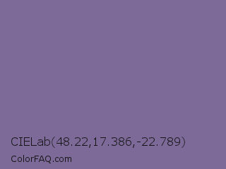 CIELab 48.22,17.386,-22.789 Color is a normal violet color and the nearest color is Kimberly #736c9f. Hex code #7d6a99 and RGB value is rgb(125,106,153). In RGB color space, this color is composed of 49% red, 42% green, 60% blue, In CMYK color space, this color is composed of 18% cyan, 31% magenta, 0% yellow , 40% black , In HSL color space, this color has a hue angle of 264° , 19% saturation and 51% lightness.