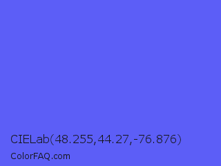 CIELab 48.255,44.27,-76.876 Color is a light blue color and the nearest color is Very Light Blue #6666ff. Hex code #5c5ef7 and RGB value is rgb(92,94,247). In RGB color space, this color is composed of 36% red, 37% green, 97% blue, In CMYK color space, this color is composed of 63% cyan, 62% magenta, 0% yellow , 3% black , In HSL color space, this color has a hue angle of 239° , 91% saturation and 66% lightness.