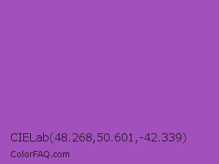 CIELab 48.268,50.601,-42.339 Color is a normal purple color and the nearest color is Purple Plum #9c51b6. Hex code #a250bb and RGB value is rgb(162,80,187). In RGB color space, this color is composed of 64% red, 31% green, 73% blue, In CMYK color space, this color is composed of 13% cyan, 57% magenta, 0% yellow , 27% black , In HSL color space, this color has a hue angle of 286° , 44% saturation and 52% lightness.