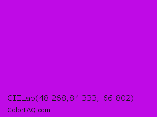 CIELab 48.268,84.333,-66.802 Color is a normal purple color and the nearest color is Vivid Mulberry #b80ce3. Hex code #bf0ae6 and RGB value is rgb(191,10,230). In RGB color space, this color is composed of 75% red, 4% green, 90% blue, In CMYK color space, this color is composed of 17% cyan, 96% magenta, 0% yellow , 10% black , In HSL color space, this color has a hue angle of 289° , 92% saturation and 47% lightness.