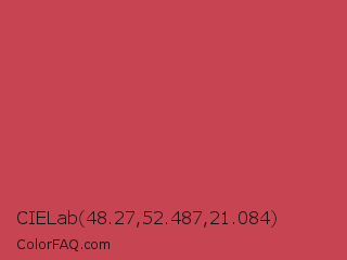 CIELab 48.27,52.487,21.084 Color is a normal red color and the nearest color is Brick Red #cb4154. Hex code #c74552 and RGB value is rgb(199,69,82). In RGB color space, this color is composed of 78% red, 27% green, 32% blue, In CMYK color space, this color is composed of 0% cyan, 65% magenta, 59% yellow , 22% black , In HSL color space, this color has a hue angle of 354° , 54% saturation and 53% lightness.