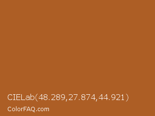 CIELab 48.289,27.874,44.921 Color is a normal orange color and the nearest color is Desert #ae6020. Hex code #ad5e25 and RGB value is rgb(173,94,37). In RGB color space, this color is composed of 68% red, 37% green, 15% blue, In CMYK color space, this color is composed of 0% cyan, 46% magenta, 79% yellow , 32% black , In HSL color space, this color has a hue angle of 25° , 65% saturation and 41% lightness.