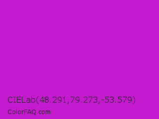 CIELab 48.291,79.273,-53.579 Color is a normal magenta color and the nearest color is Steel Pink #cc33cc. Hex code #c41bcf and RGB value is rgb(196,27,207). In RGB color space, this color is composed of 77% red, 11% green, 81% blue, In CMYK color space, this color is composed of 5% cyan, 87% magenta, 0% yellow , 19% black , In HSL color space, this color has a hue angle of 296° , 77% saturation and 46% lightness.