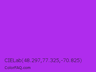 CIELab 48.297,77.325,-70.825 Color is a normal purple color and the nearest color is Veronica #a020f0. Hex code #af2ced and RGB value is rgb(175,44,237). In RGB color space, this color is composed of 69% red, 17% green, 93% blue, In CMYK color space, this color is composed of 26% cyan, 81% magenta, 0% yellow , 7% black , In HSL color space, this color has a hue angle of 281° , 84% saturation and 55% lightness.