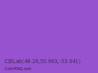 CIELab 48.29,50.993,-53.941 Color is a normal purple color and the nearest color is Amethyst #9966cc. Hex code #9652cf and RGB value is rgb(150,82,207). In RGB color space, this color is composed of 59% red, 32% green, 81% blue, In CMYK color space, this color is composed of 28% cyan, 60% magenta, 0% yellow , 19% black , In HSL color space, this color has a hue angle of 273° , 57% saturation and 57% lightness.