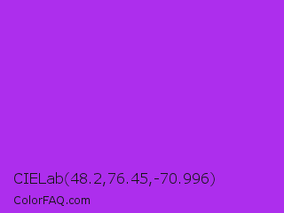 CIELab 48.2,76.45,-70.996 Color is a normal purple color and the nearest color is Veronica #a020f0. Hex code #ad2eed and RGB value is rgb(173,46,237). In RGB color space, this color is composed of 68% red, 18% green, 93% blue, In CMYK color space, this color is composed of 27% cyan, 81% magenta, 0% yellow , 7% black , In HSL color space, this color has a hue angle of 280° , 84% saturation and 55% lightness.