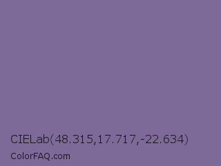 CIELab 48.315,17.717,-22.634 Color is a normal violet color and the nearest color is Kimberly #736c9f. Hex code #7e6a99 and RGB value is rgb(126,106,153). In RGB color space, this color is composed of 49% red, 42% green, 60% blue, In CMYK color space, this color is composed of 18% cyan, 31% magenta, 0% yellow , 40% black , In HSL color space, this color has a hue angle of 266° , 19% saturation and 51% lightness.