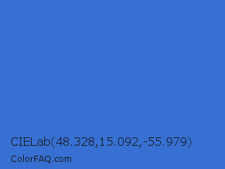CIELab 48.328,15.092,-55.979 Color is a normal blue color and the nearest color is Han Blue #446ccf. Hex code #3770d2 and RGB value is rgb(55,112,210). In RGB color space, this color is composed of 22% red, 44% green, 82% blue, In CMYK color space, this color is composed of 74% cyan, 47% magenta, 0% yellow , 18% black , In HSL color space, this color has a hue angle of 218° , 63% saturation and 52% lightness.