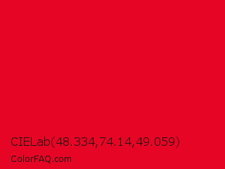 CIELab 48.334,74.14,49.059 Color is a normal red color and the nearest color is Spanish Red #e60026. Hex code #e60524 and RGB value is rgb(230,5,36). In RGB color space, this color is composed of 90% red, 2% green, 14% blue, In CMYK color space, this color is composed of 0% cyan, 98% magenta, 84% yellow , 10% black , In HSL color space, this color has a hue angle of 352° , 96% saturation and 46% lightness.
