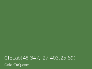 CIELab 48.347,-27.403,25.59 Color is a normal green color and the nearest color is Fern Green #4f7942. Hex code #507e46 and RGB value is rgb(80,126,70). In RGB color space, this color is composed of 31% red, 49% green, 27% blue, In CMYK color space, this color is composed of 37% cyan, 0% magenta, 44% yellow , 51% black , In HSL color space, this color has a hue angle of 109° , 29% saturation and 38% lightness.