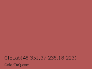CIELab 48.351,37.238,18.223 Color is a normal red color and the nearest color is Matrix #b05d54. Hex code #b35756 and RGB value is rgb(179,87,86). In RGB color space, this color is composed of 70% red, 34% green, 34% blue, In CMYK color space, this color is composed of 0% cyan, 51% magenta, 52% yellow , 30% black , In HSL color space, this color has a hue angle of 1° , 38% saturation and 52% lightness.