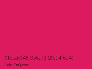 CIELab 48.356,72.29,14.614 Color is a normal rose color and the nearest color is Ruby #e0115f. Hex code #de1a5e and RGB value is rgb(222,26,94). In RGB color space, this color is composed of 87% red, 10% green, 37% blue, In CMYK color space, this color is composed of 0% cyan, 88% magenta, 58% yellow , 13% black , In HSL color space, this color has a hue angle of 339° , 79% saturation and 49% lightness.