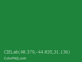 CIELab 48.379,-44.835,31.136 Color is a normal green color and the nearest color is Dark Spring Green #177245. Hex code #1e843b and RGB value is rgb(30,132,59). In RGB color space, this color is composed of 12% red, 52% green, 23% blue, In CMYK color space, this color is composed of 77% cyan, 0% magenta, 55% yellow , 48% black , In HSL color space, this color has a hue angle of 137° , 63% saturation and 32% lightness.