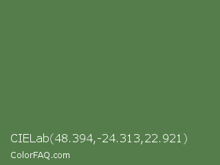 CIELab 48.394,-24.313,22.921 Color is a normal green color and the nearest color is Hippie Green #53824b. Hex code #557d4b and RGB value is rgb(85,125,75). In RGB color space, this color is composed of 33% red, 49% green, 29% blue, In CMYK color space, this color is composed of 32% cyan, 0% magenta, 40% yellow , 51% black , In HSL color space, this color has a hue angle of 108° , 25% saturation and 39% lightness.