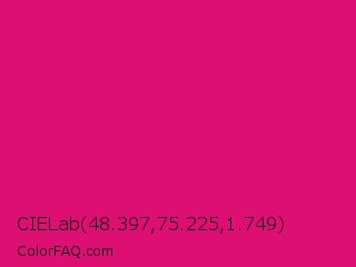 CIELab 48.397,75.225,1.749 Color is a normal rose color and the nearest color is Dogwood Rose #d71868. Hex code #de0f73 and RGB value is rgb(222,15,115). In RGB color space, this color is composed of 87% red, 6% green, 45% blue, In CMYK color space, this color is composed of 0% cyan, 93% magenta, 48% yellow , 13% black , In HSL color space, this color has a hue angle of 331° , 87% saturation and 46% lightness.