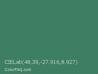 CIELab 48.39,-27.916,8.927 Color is a normal green color and the nearest color is Viridian #40826d. Hex code #3e7f63 and RGB value is rgb(62,127,99). In RGB color space, this color is composed of 24% red, 50% green, 39% blue, In CMYK color space, this color is composed of 51% cyan, 0% magenta, 22% yellow , 50% black , In HSL color space, this color has a hue angle of 154° , 34% saturation and 37% lightness.