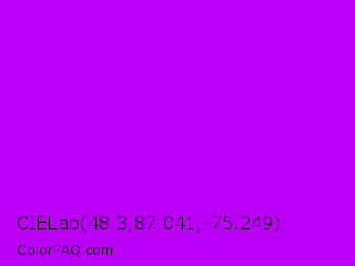 CIELab 48.3,87.041,-75.249 Color is a normal purple color and the nearest color is Electric Purple #bf00ff. Hex code #ba00f5 and RGB value is rgb(186,0,245). In RGB color space, this color is composed of 73% red, 0% green, 96% blue, In CMYK color space, this color is composed of 24% cyan, 100% magenta, 0% yellow , 4% black , In HSL color space, this color has a hue angle of 286° , 100% saturation and 48% lightness.