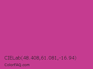 CIELab 48.408,61.081,-16.94 Color is a normal magenta color and the nearest color is Smitten #c84186. Hex code #c43d91 and RGB value is rgb(196,61,145). In RGB color space, this color is composed of 77% red, 24% green, 57% blue, In CMYK color space, this color is composed of 0% cyan, 69% magenta, 26% yellow , 23% black , In HSL color space, this color has a hue angle of 323° , 53% saturation and 50% lightness.