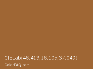 CIELab 48.413,18.105,37.049 Color is a normal orange color and the nearest color is Sepia Skin #9e5b40. Hex code #9f6634 and RGB value is rgb(159,102,52). In RGB color space, this color is composed of 62% red, 40% green, 20% blue, In CMYK color space, this color is composed of 0% cyan, 36% magenta, 67% yellow , 38% black , In HSL color space, this color has a hue angle of 28° , 51% saturation and 41% lightness.